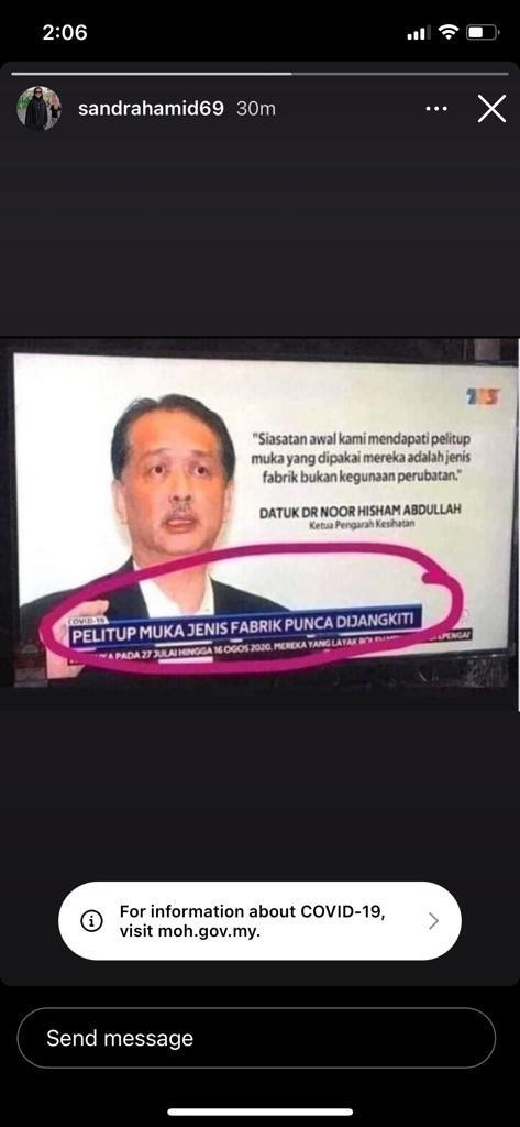 . KUALA LUMPUR 15 Jan Kementerian Kesihatan Malaysia KKM menafikan kesahihan tajuk berita COVID-19. Periksa kesahihan sebelum menyebar Menurut laporan. Pelitup muka jenis fabrik punca dijangkiti virus Civid-19 tapi kena Pertubuhan Kesihatan Sedunia WHO benarkan pemakaian topeng muka jenis ini.